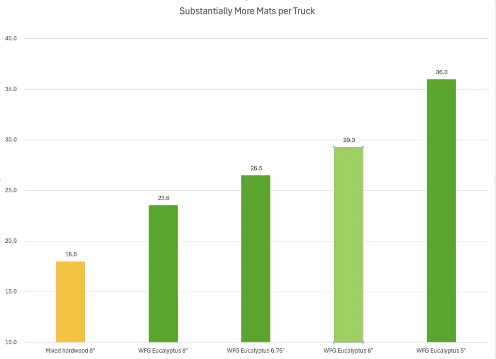 Over time, as Eucalyptus mats wear in, you can increase from about 25 to around 30 mats per truck for 6″ timber mats and from about 12 to roughly 15 crane mats per truck for 12″ mats, further improving your economics.